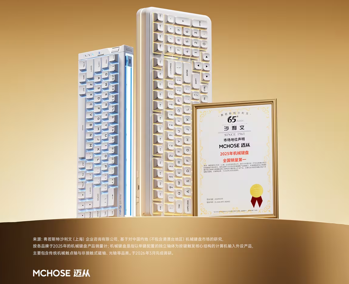 3月2日,迈从正式发布2026年度旗舰赛事级全铝磁轴键盘—Ace 68 GT。该产品直击电竞玩家核心需求的精准定位,以及性能、手感、设计、质感无短板的综合产品力,开售三天内迅速登顶京东键盘新品榜与好评榜双榜第一。
